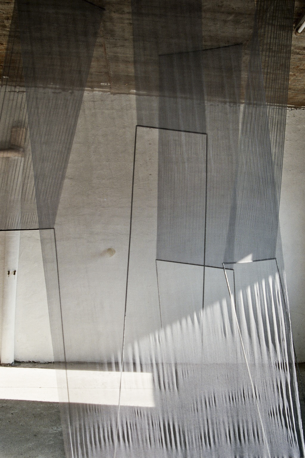 Der an der Raum-Decke montierte, fast transparente Stoff wird durch das Gewicht der Eisen-Bügel glatt gespannt. Je nach Blickwinkel überschneiden sich Teile der Stoff-Bahnen und bilden graue Flächen unterschiedlicher Farb-Dichte im Raum.